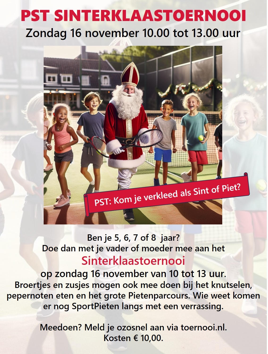 Ben je 5, 6, 7 of 8 jaar? Doe dan met je vader of moeder mee aan het Sinterklaastoernooi. Tennissen, knutselen, pepernoten eten en natuurlijk zwaaien naar Sinterklaas die zoals altijd langs vaart bij PST.